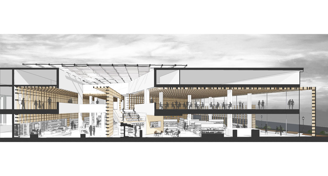 In this proposal, Lukstudio envisions a system of wooden shelves, organized within solid and transparent volumes that intersect and overlap. The design follows the concept of an archive; stacking, sorting and displaying supermarket products. The archival nature of the structure becomes a continuous architectural language that is used for the product display areas, screen partitions, and even for the design of the façade. The omnipresent wooden shelves create a visual sense of order, while also helping to connect the different functions and spaces.